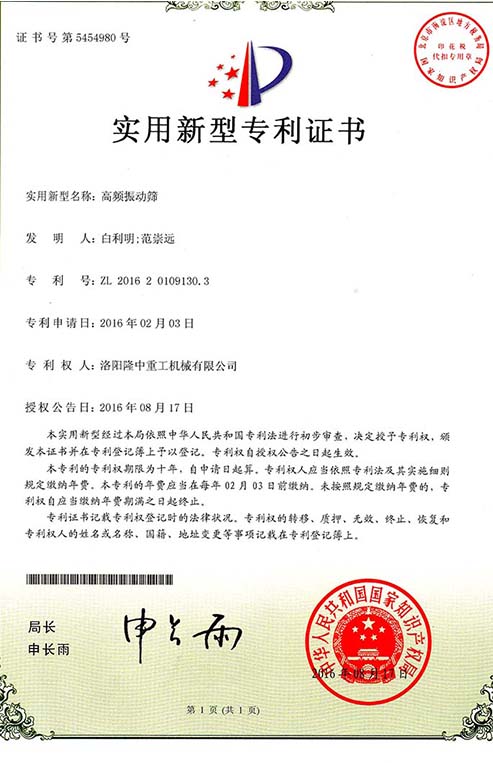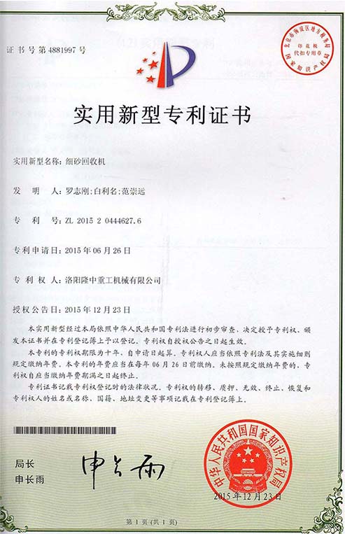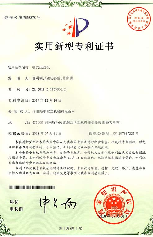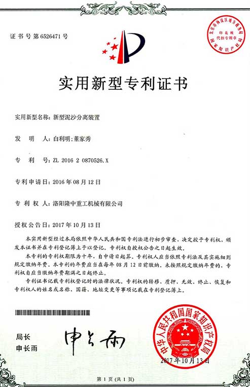 Long Zhong heavy industry patent certificate